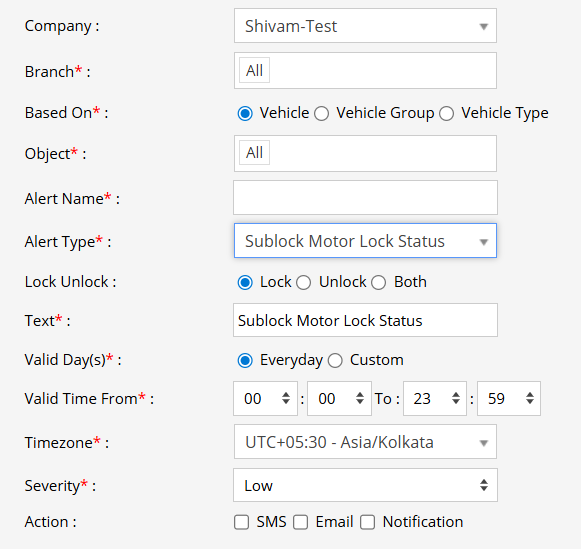 - Object Group: Select a group of assets or vehicles with Sublock devices; all within the group will be monitored for lock/unlock status changes.