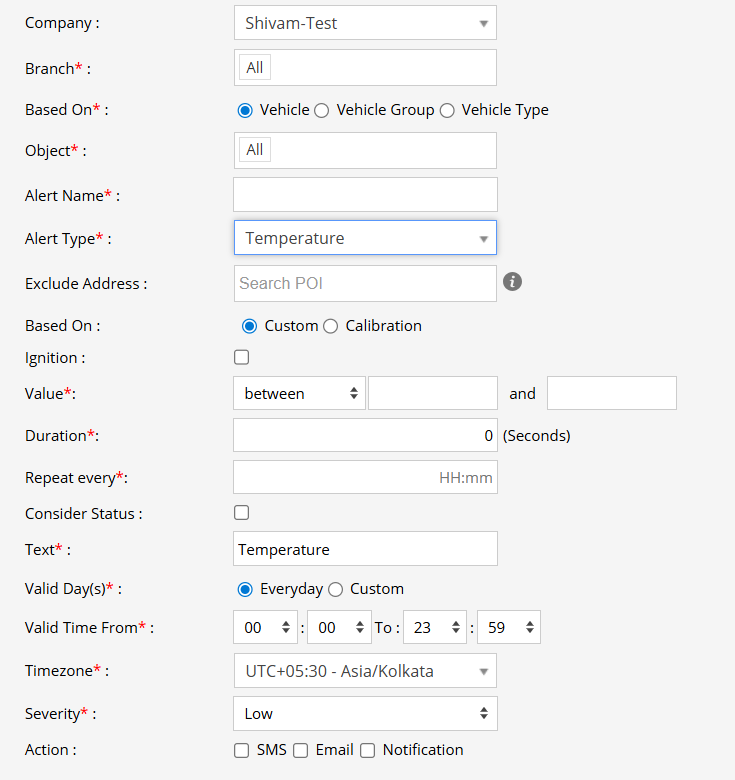 The Temperature Alert is triggered when the temperature recorded by the sensor crosses the predefined threshold based on custom values or calibrated temperature readings. This alert helps fleet managers monitor temperature-sensitive vehicles or assets such as refrigerated trucks, cold-chain cargo, and machinery requiring specific temperature conditions. Alerts ensure that temperature deviations are detected instantly so corrective action can be taken to avoid spoilage, damage, or operational issues. Whenever the temperature exceeds or falls below the configured limits, the system automatically notifies the responsible personnel.