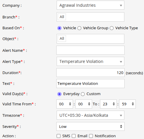 - Enter the Valid Time From and To. The alert will be generated inside the time range that you have selected.