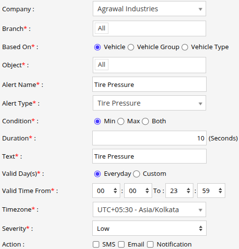 When a vehicle is parked or temporarily stopped, and a tire’s pressure goes below or above the set limit, the system monitors the condition. If the Condition is set to Min and the tire pressure stays below the allowed level for longer than the configured Duration, the alert is triggered. The fleet manager or driver receives a notification via SMS, Email, or In-App Notification with the alert message, allowing quick action to prevent tire damage, improve safety, and avoid downtime.