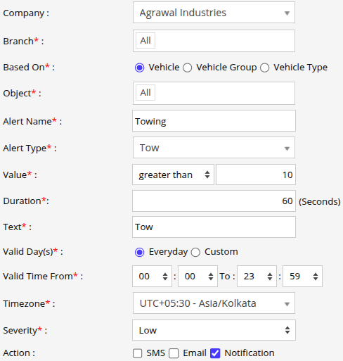 A Tow Alert is triggered when a vehicle registers movement while its ignition is turned off. For example, if a delivery truck is parked at a warehouse with the ignition off and starts moving above the defined threshold speed for more than 10 seconds while in a stopped state, the system identifies this as a towing event. Based on the configured actions, an SMS or in-app notification is sent to the fleet manager, indicating possible unauthorized towing or relocation of the vehicle.