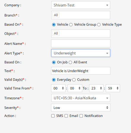 An Underweight alert is triggered when a device or vehicle carries a load below the configured weight threshold, either during a specific job or any event, depending on configuration. Notifications are sent via SMS, Email, or In-App Notification, enabling fleet managers or operators to take corrective actions, ensure proper loading, and maintain operational compliance.