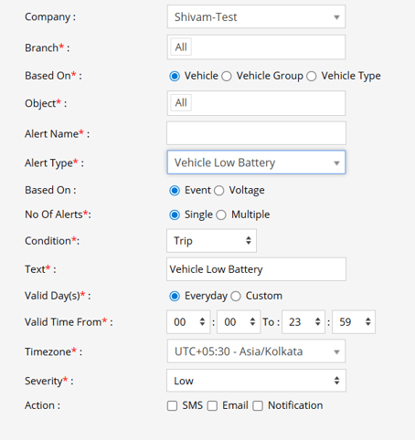- From the Alert Type dropdown, choose Vehicle Low Battery.