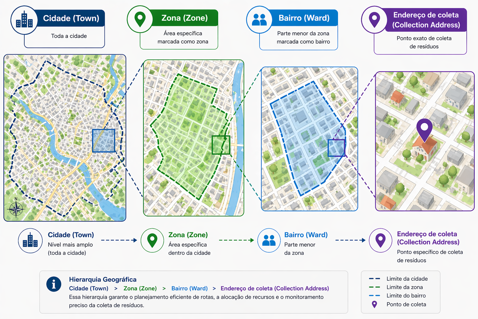 A cidade funciona como uma área administrativa central, reunindo todas as divisões subordinadas, como zonas, bairros e endereços de coleta, sob uma estrutura unificada. Isso ajuda a consolidar relatórios, alocar recursos e acompanhar o desempenho de toda a região.
